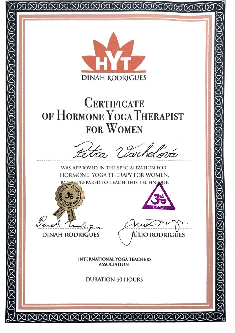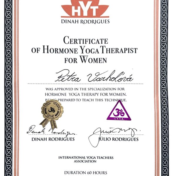 Díky vlastním hormonálním obtížím jsem se začala hlouběji zajímat o přirozené cesty, jak hormonální rovnováhu podpořit. Absolvovala jsem certifikaci Hormonální jógové terapie dle Dinah Rodrigues, kterou dnes aktivně využívám ve své praxi. Metodu jsem si nejprve prošla sama na sobě a mohu potvrdit její velmi pozitivní účinky – zlepšení vitality, větší stabilitu, více energie i celkovou psychickou pohodu. Právě osobní zkušenost mě utvrzuje v tom, že tato technika může být silnou a zároveň šetrnou podporou pro ženy v různých životních obdobích.